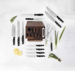 A Base Multifuncional Royal Prestige® é feita de madeira de acácia natural antibacteriana, resistente à umidade. Ela preserva a integridade das lâminas de sua coleção de facas e armazena até 17 utensílios, como facas e tesoura. Aproveite o afiador integrado para realinhar o fio e afiar suas facas.