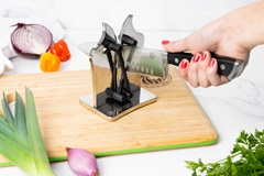 De diseño innovador y elegante, el Royal Prestige® Knife Sharpener te ayuda a mantener tus cuchillos listos para usar, permitiéndote afilar, alinear y pulir todo tipo de cuchillos, ya sean de hojas lisas o serradas. Su sistema de mariposa se ajusta automáticamente para adaptarse a los ángulos de la hoja.