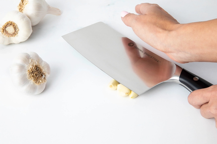 El Royal Prestige® Cleaver es el cuchillo más grande para cortar y picar alimentos. Su hoja es más ancha y pesada y te facilitará cualquier corte. Su renovado mango disminuye la fatiga y tiene el balance perfecto para que puedas controlarlo como los profesionales. Además, cuenta con un filo de fábrica sin igual.